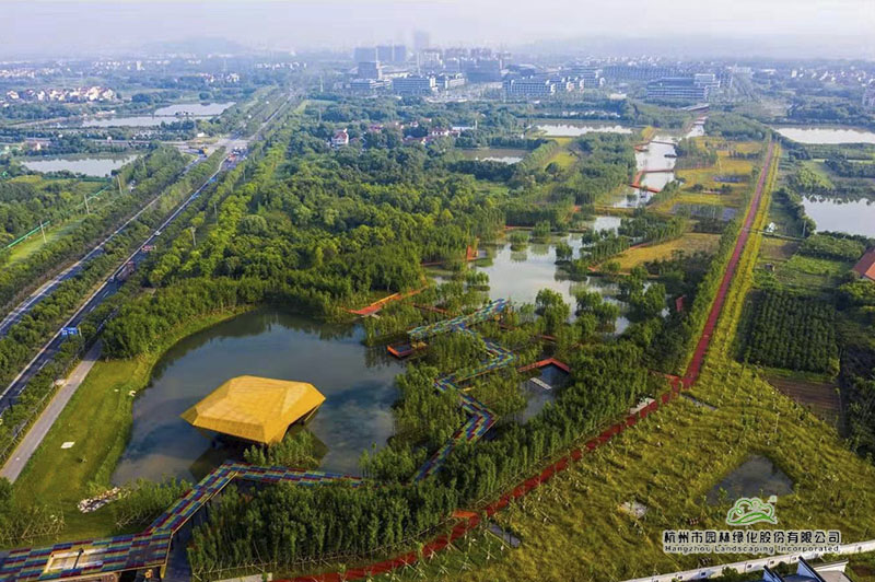 绿道建设充分融入海绵城市理念,从铺装材料的选择到施工过程,均充分体现生态环保,与整个公园景观和谐相融,集生态环保、观赏游玩、休闲运动为一体。沿绿道而行,蜿蜒交错约2公里的空中廊桥,让人体验林中穿梭、空中漫步;‘钻石切割、珍珠光泽’的珍珠凉亭,夜晚,在灯光的折射下,会散发出迷人的光泽,犹如一串闪耀夺目的珍珠,璀璨夺目。从高空俯瞰,红色的绿道在碧水绿树中穿行,将沿途景观有机串连,形成一幅风格鲜明的生态风景画卷。