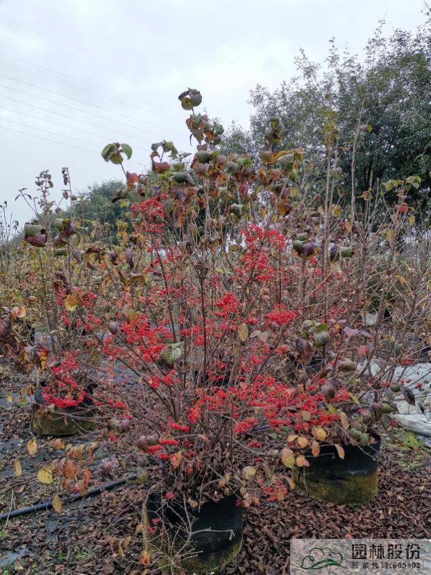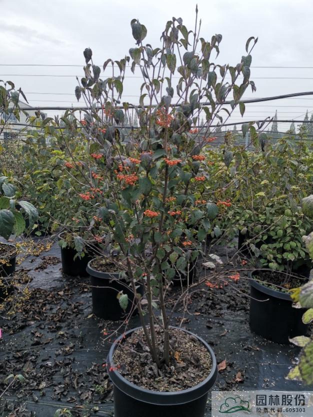 忍冬科荚蒾属,落叶灌木,株型紧凑聚拢,直立性强。叶暗绿色,聚伞花序白色,春季开花。核果球状卵形,果实颜色由绿色变成黄色,后逐渐转成红色,观果期长,果量和果实直径均较大。该种是荚蒾属中观果时间最长的物种。生长速度快,较耐修剪,耐寒耐干旱,适合工程应用或庭院观赏。