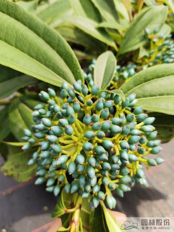 忍冬科荚蒾属,常绿灌木,植株紧凑密实,叶色亮绿,颇富生机。叶汁液具有特殊香味。花量大,圆锥花序顶生,花苞顶端粉红色,展开后花冠白色,早春开花。果实鲜红饱满,像葡萄一样挂于每个叶腋,颇有丰收之像,观果期长。生长速度快,较耐修剪,耐寒,适合工程应用或庭院观赏。